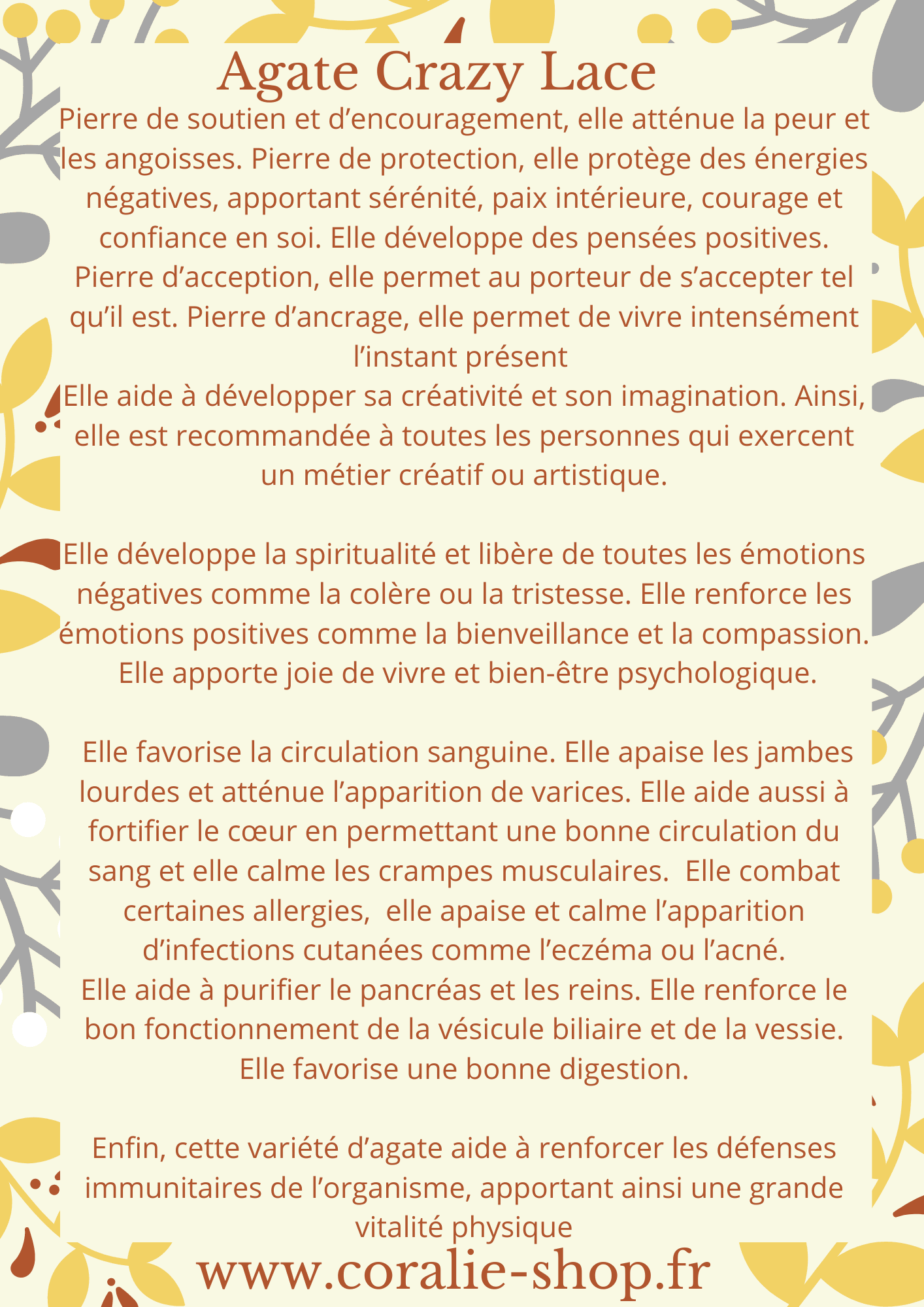Découvrez les principaux bienfaits de l'agate crazy lace dans la fiche ci dessous qui vous sera envoyée avec votre chat